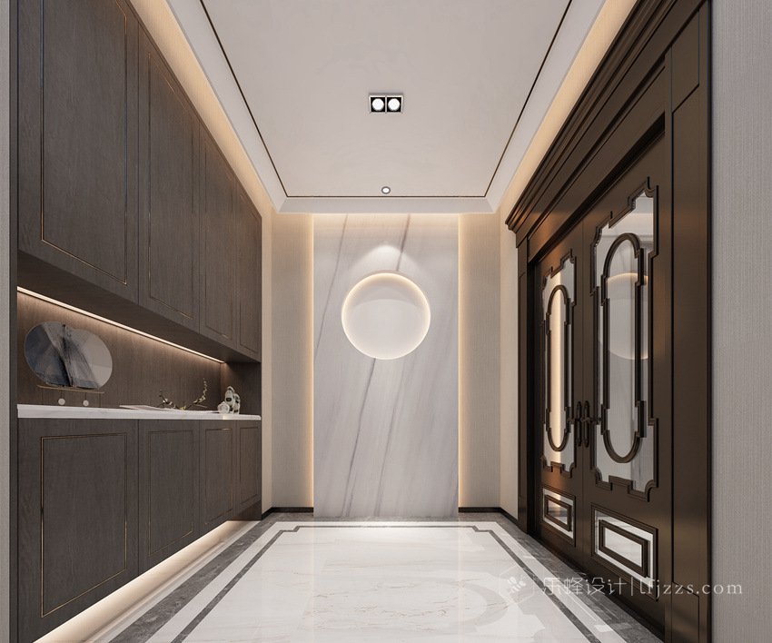 電梯出門即入戶玄關位。左側到頂鞋柜,滿足了業主的儲鞋需求,鞋柜下口的留空還可方便日常隨脫隨放。雅士白的大理石端景,簡約不失大氣,暗藏燈帶增加了整體空間的線條感,還可補充玄關采光,美觀實用。端景右側的通透式銅門,既滿足了玄關的采光功能,又可兼顧防盜功能。