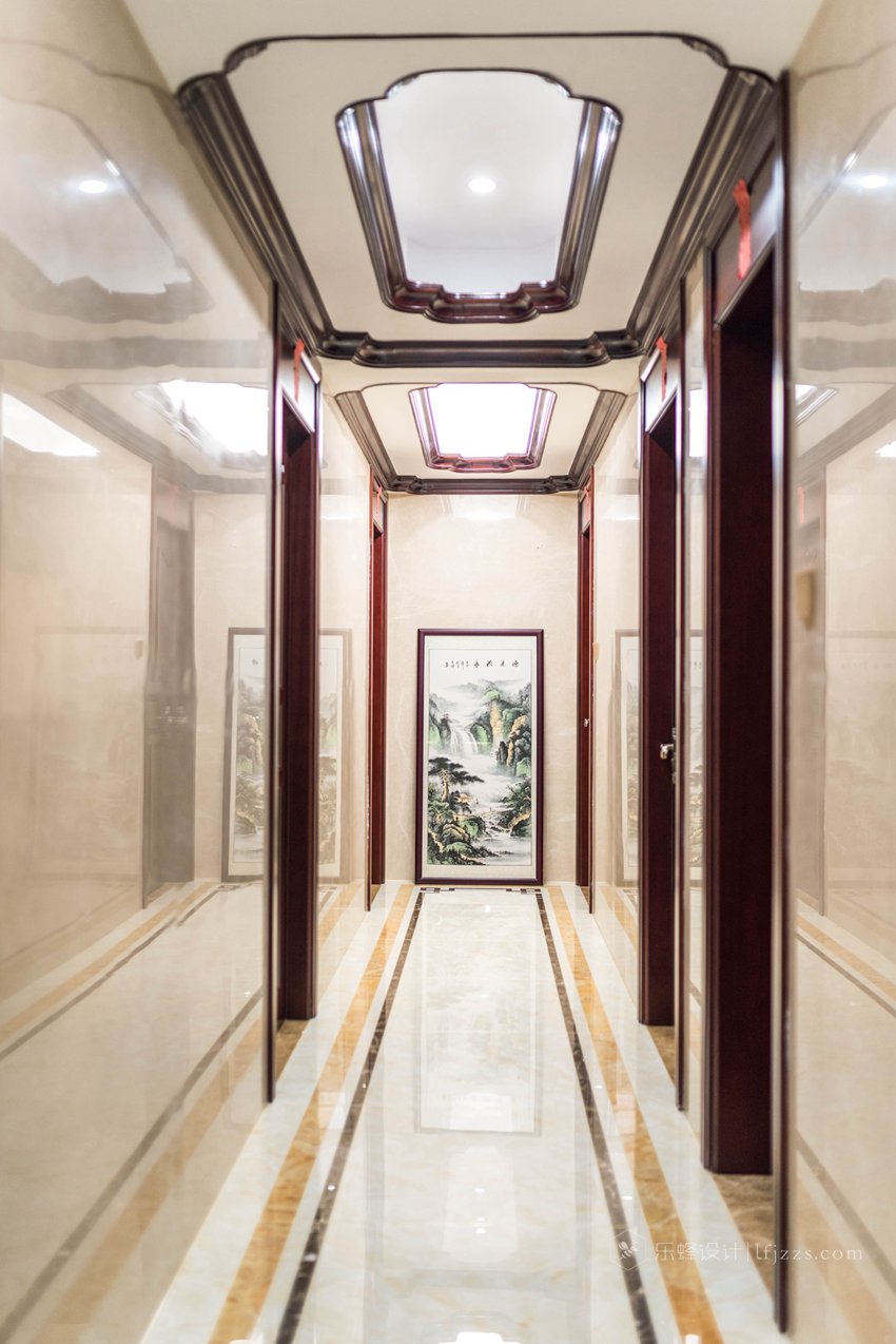 此外,在長廊過道中,大膽采用極富視覺沖擊力的藝術山水畫,使空間更富澄澈高雅,更具靈氣和韻味。