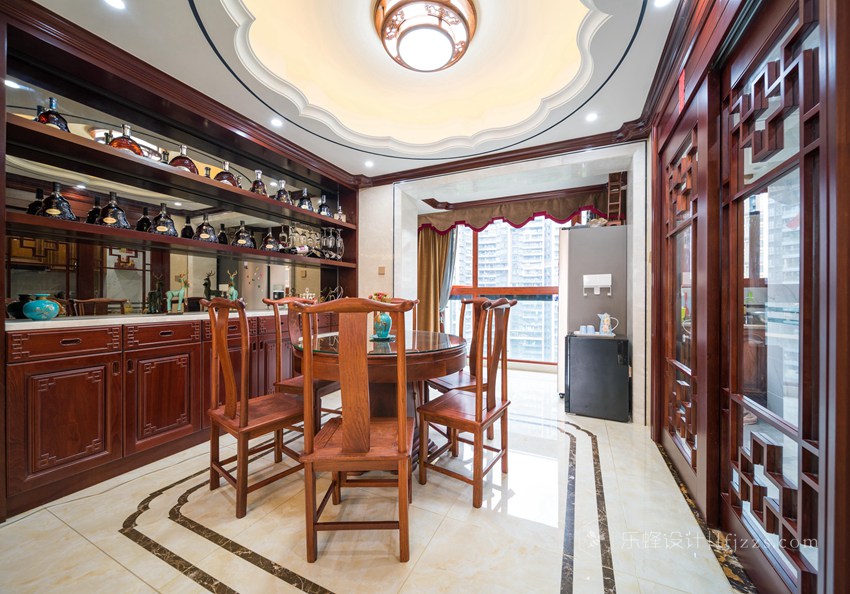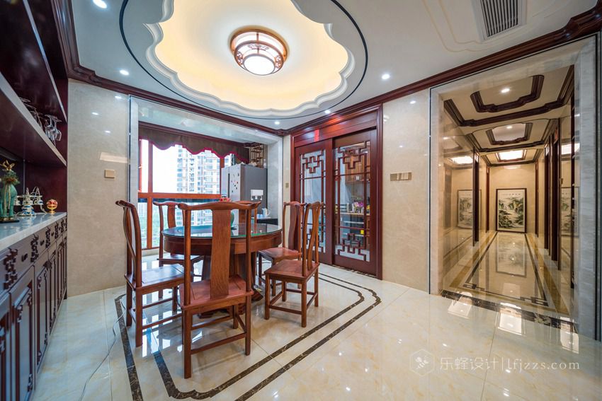 餐廳中間遵循建筑設計意圖,空間半封閉的造型來劃分區域,中式回形紋的門窗,不僅展示了中式風的獨特韻味,還寓意吉祥如意,五福臨門。