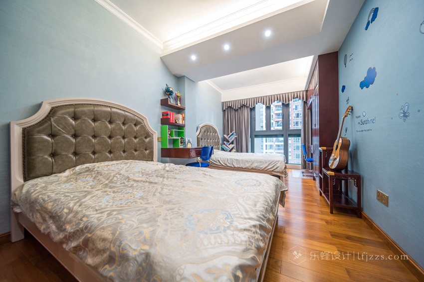次臥通過調性的調整,保留床的中式調性之余,通過藝術的組合,再加上墻上的卡通貼紙,讓次臥有種煥然一新的感覺。