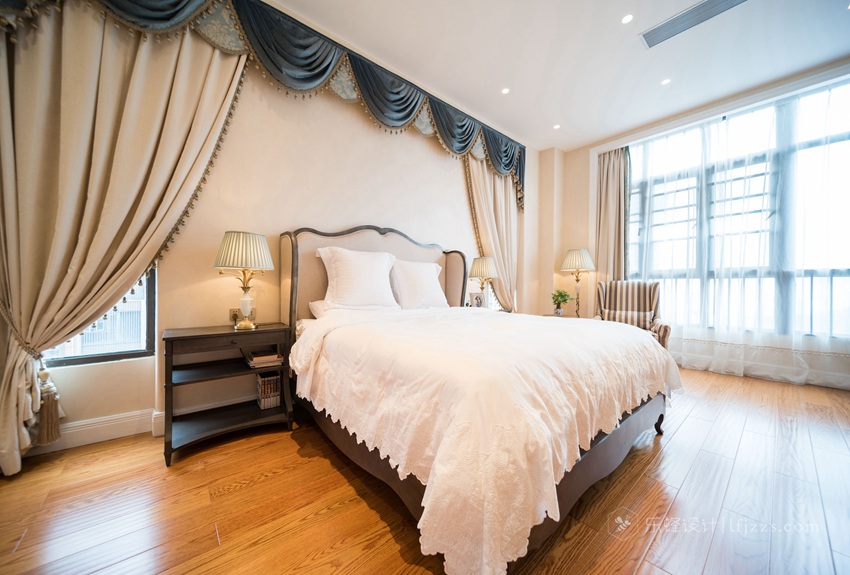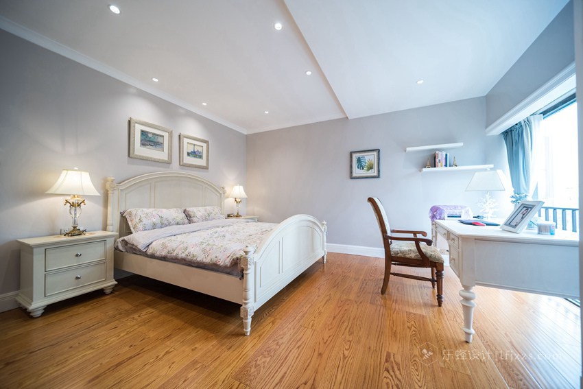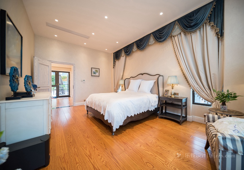 主臥室保持通透干凈的視野,做到透光通風,讓生活偏為現代都市;原木地板為整個臥室升溫,白色床品組合構成空間的冷靜,與整體空間色彩搭配相融合,構成溫馨。