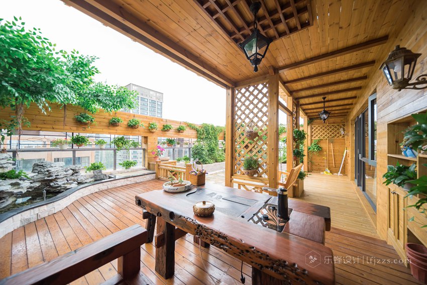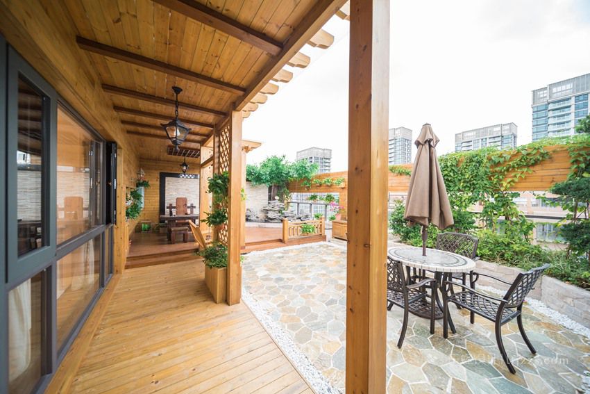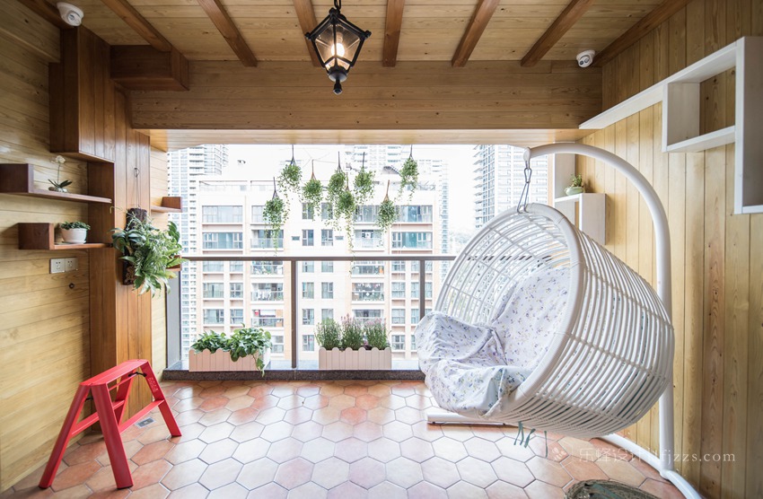 陽臺之中設置親子空間,給家中增添幾份樂趣,而兩邊造型壁柜適合載種盆栽。