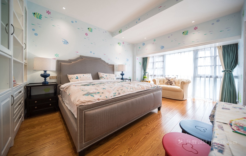 次臥也秉承一致的原木情懷,大大的落地窗讓居室陽光滿溢,墻上的卡通畫,起到很好的跳色作用,使整個臥室色彩更豐富活躍。
