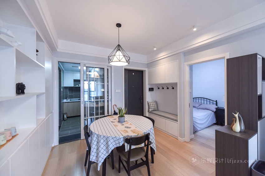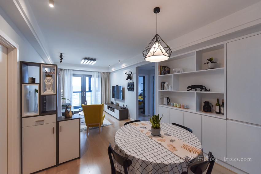 客廳旁的餐廳,發揮了空間更大的使用價值。另外附近做了儲存功能區,起到可以展示、收納物品的作用。高柜子不影響空間的通透感,可以說是兩全其美了。