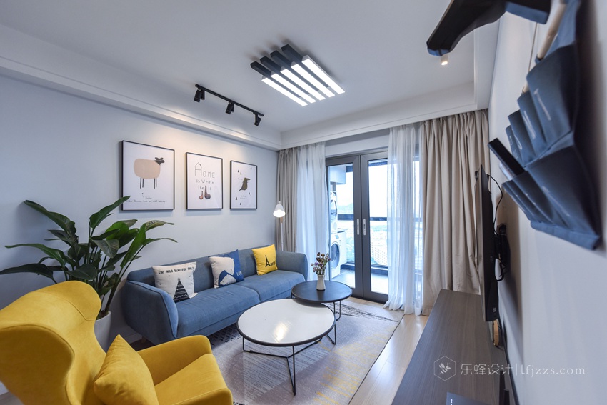 客廳用深藍色沙發作為視覺中心,也是整個色調的重心,電視背景墻的淺藍色與沙發的深藍色相互呼應,形成整體的藍白色系,更為清雅+溫馨。