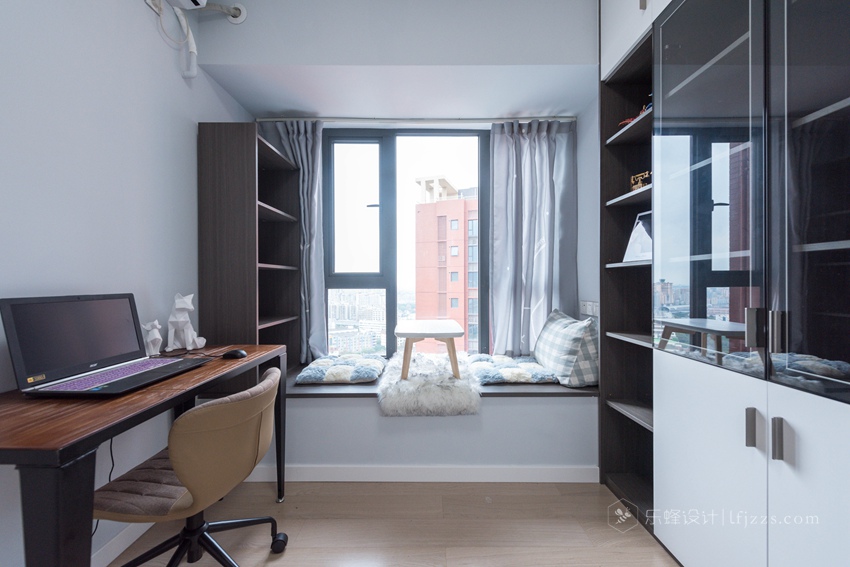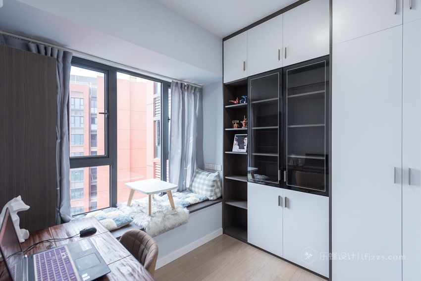 書房主要考慮綜合功能體驗為主,電腦桌便于使用電腦學習,而臺階適合看書休息所用。另外,備有書架作為藏書之用。