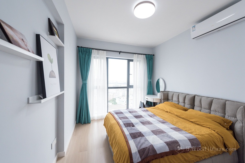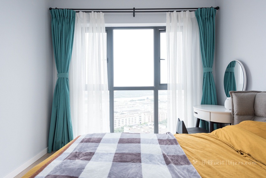臥室涂刷了駝色的漆,搭配原木地板,素靜而樸質,藍窗簾搭配白色紗幔,營造清新,讓人不自覺就放松下來。