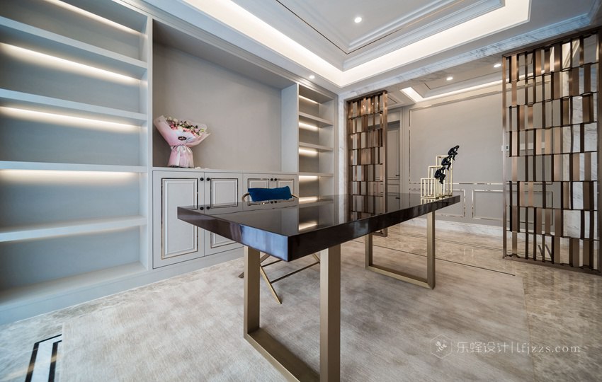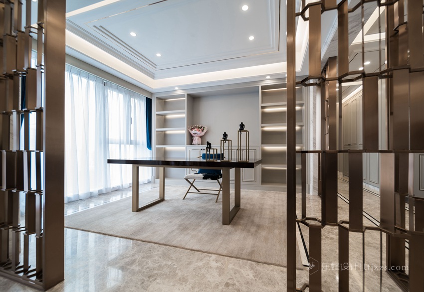 書房是個半開放的房間,可以從過道走過來。搭配別樣的書櫥,層次之間,奠定了空間的淡暖溫馨;書架和書桌組合現代實用,與落地窗簾成就生活的溫實和安謐。