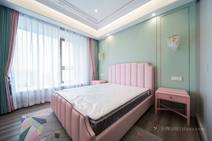 次臥遵從主臥的大體風格,暗粉配米白窗簾讓空間顯得更為干凈和寧靜,特色的花紋地毯更顯沉穩。