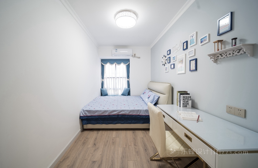 兒童房以藍色調為主,煥發時尚新生的力量;定制的幾何書柜不僅增強了空間的實用性,同時書桌構成了孩子的學習區域。