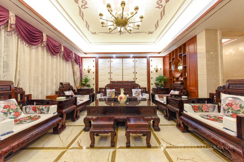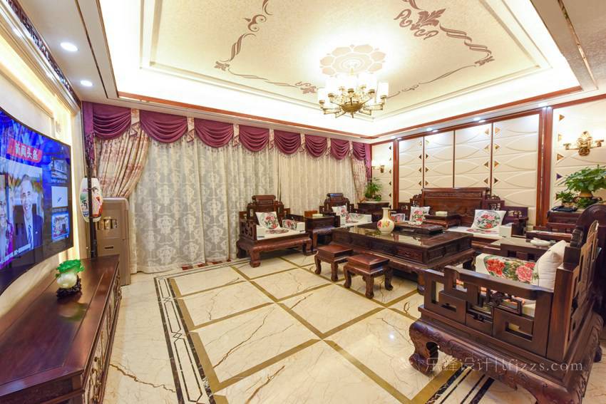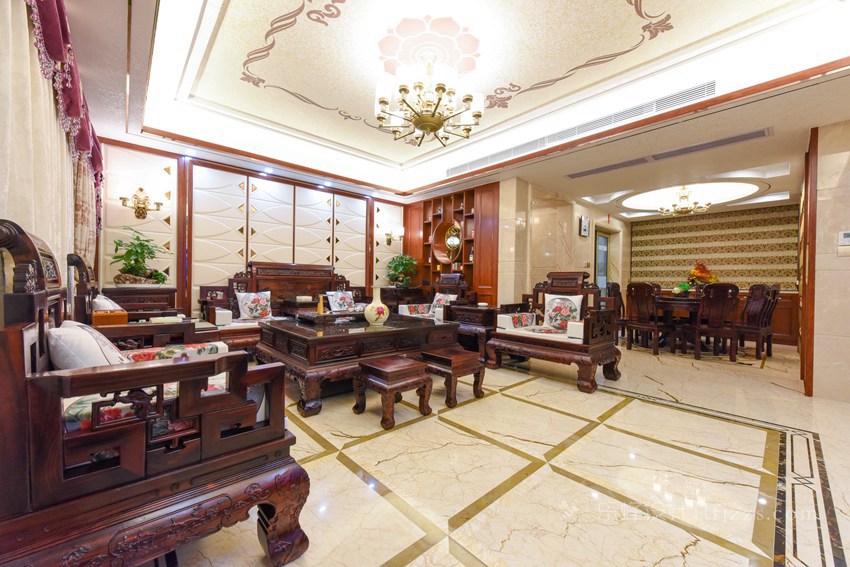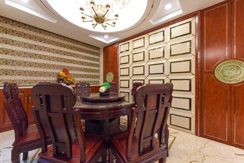 蔡先生家的設計中式元素為主,家人對中式文化的底蘊有很高的向往。案例中客廳餐廳入戶合理分區,形成通透、共享的室內格局,實木線條元素穿梭于整個空間,餐廳及過道中造型背景墻面運用玉的元素點綴重點使整個氛圍添加活力。墻面上抽象的現代畫作極富時尚氣息。整體風格以簡約為原則,適當的立體結構上鑲飾黑色鏡面不銹鋼,也流露出金屬的本色硬朗的色彩,及完成了“點”的作用;石材的貫穿裝飾完美的體現了裝飾風格的主體文化。天花的裝飾燈槽突破了常規繁鎖吊頂的作法,展現了客廳天花的立體空間,內藏燈帶,印射出來的不是眩眼的光源,而是柔和溫馨的二次間接光源。