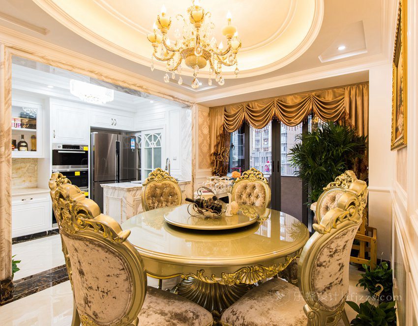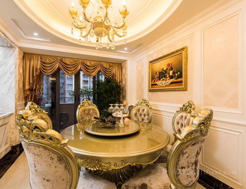 餐廳以歐式線條勾勒出不同的裝飾造型,墻上的掛畫,反襯出空間的動律和貴氣;古典餐椅搭配圓桌,讓就餐氛圍變得和暖而精奢。