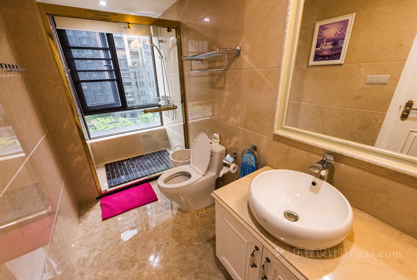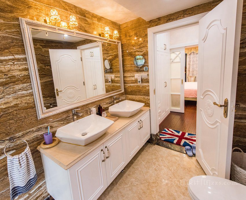 衛生間的布局以干濕分離設計,讓小空間更有生活條理。梳妝鏡背景墻特殊的紋理質感,層次之中,增添時尚。
