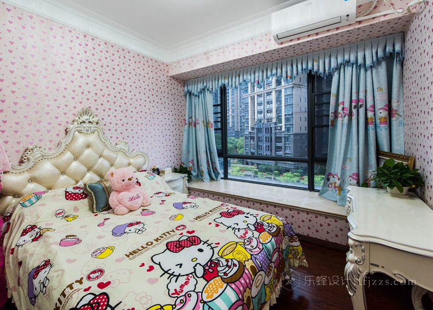 主臥以原木地板來造就樸素,搭配淡藍窗簾和卡通床品,顯得更為溫馨;紫色墻紙壁紙給來趣味,營造出一個足夠舒適、童心時尚的空間。
