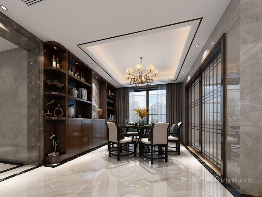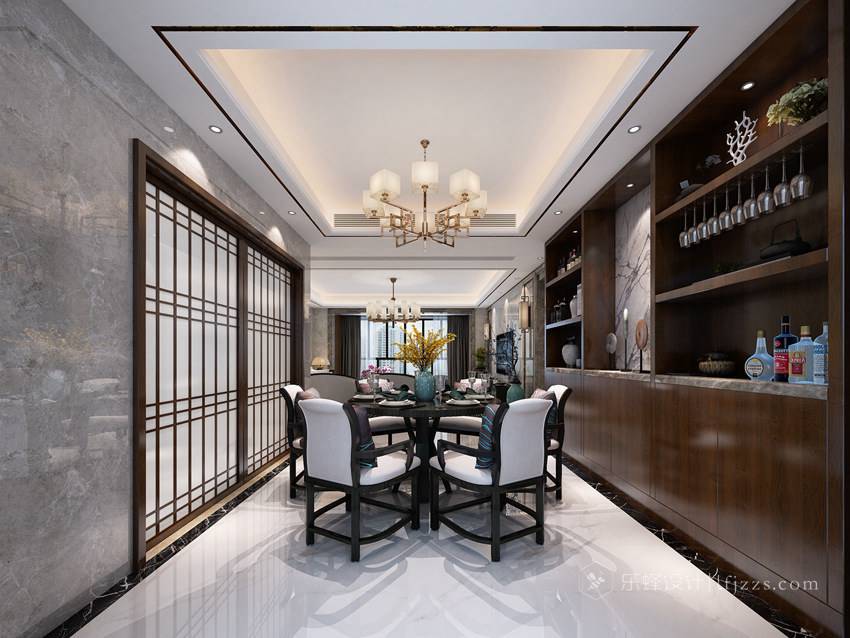 現場定制的餐邊柜,用接近原木色的漆面為它加持,6開放4隱蔽式的柜體造型處理,展現出家具儲藏功能的同時,還能淋漓盡致地詮釋出新中式空間的雅趣。天花處的簡單吊頂造型,加設深咖色鋼線走邊,完美避開中式空間的繁雜臃腫,也讓餐廳在這排列有序的線條空間里找到屬于它的大氣時尚。