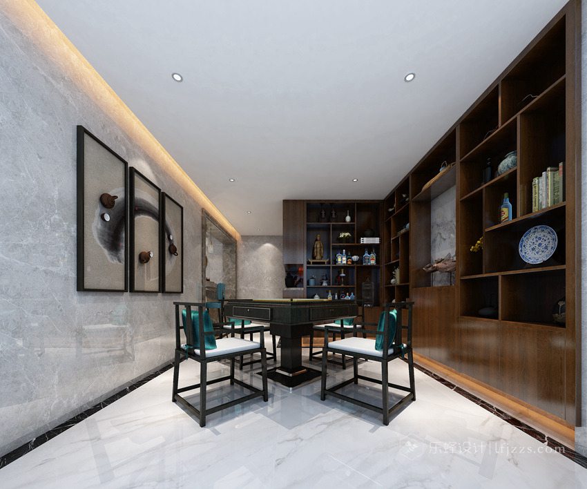 客廳電視背景墻有了天然大理石的山水紋理妝點,濃郁的文墨氣息撲鼻而來,不禁讓人想起閑適而飄逸的田園小宅生活。沙發背景墻處用淺灰色大理石聯通棋牌室與玄關埡口,搭配輪廓方正的中式簡約布藝沙發,破解了淺灰的硬朗,并給空間帶來一絲絲溫暖。