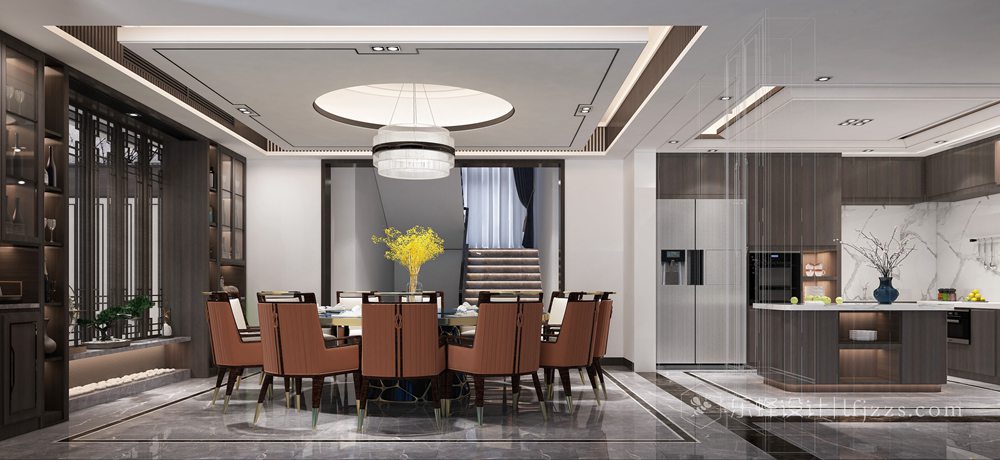 本案為現(xiàn)代中式風(fēng)格,根據(jù)客戶需求與想法,為了給業(yè)主創(chuàng)造一個(gè)穩(wěn)重與舒適的空間。空間大部分以大理石加不銹鋼條裝飾,不是純粹中式元素的堆砌,而是將傳統(tǒng)元素與現(xiàn)代設(shè)計(jì)手法巧妙融合,完美的體現(xiàn)了空間的層次感。合理運(yùn)用室內(nèi)家具以及裝飾性的工藝品,讓屋主可以得到一個(gè)更為合理的空間布局。