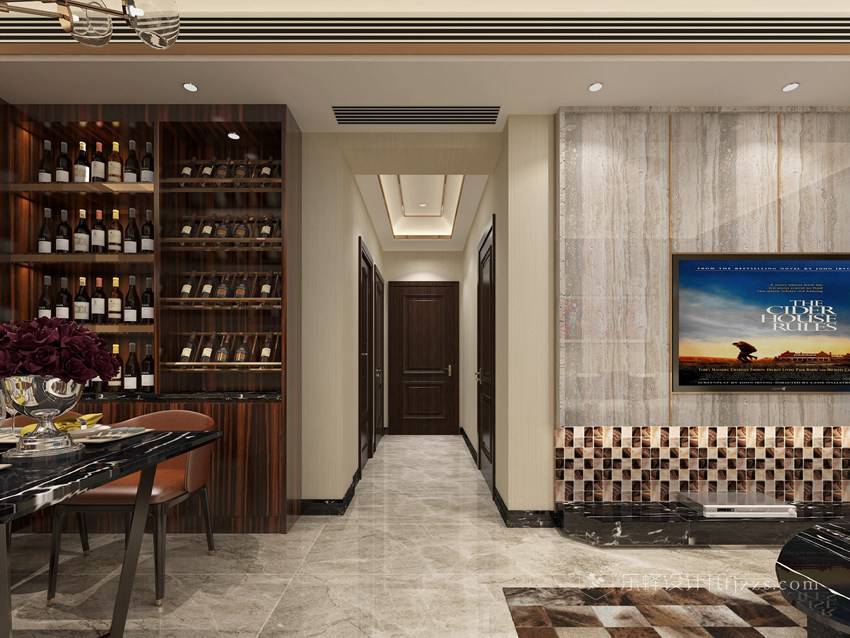 本案空間造型設計簡約流暢,運用簡潔而非對稱的直線和不銹鋼線條來塑造空間的立體感。色彩簡約,空間以白色為主基調,摒棄傳統的吊燈,使用點光源的筒燈,使燈光更有層次感,整個空間的燈光也更柔和。