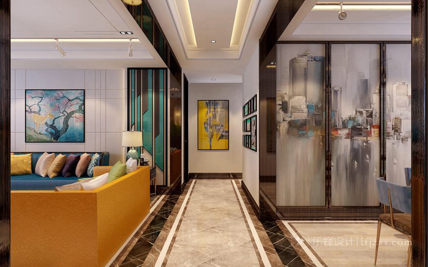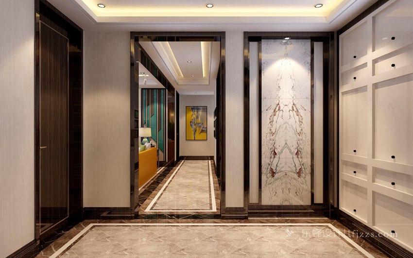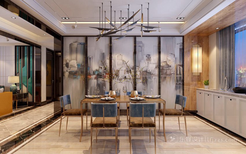 在進入客餐廳的埡口處用不銹鋼收邊,右側立面加設大理石造型墻,它的紋路跟隨著頂面射燈的光路向下延展,好似被船槳蕩起的水波,從平靜湖面破開一道口子,造型激蕩又富有美感,給新家奠定了優雅基底。
