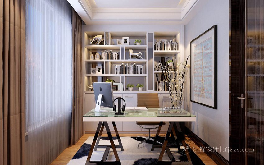 由于工作崗位的特殊性,男主會經常用到書房辦公,女主擔心久坐傷腰,還和我們一起選了一把符合人體工學的辦公椅,可以讓男主坐起來更舒適。書房的儲物同樣是空間硬需,設置一整面的書柜即可很好地解決這一需要。