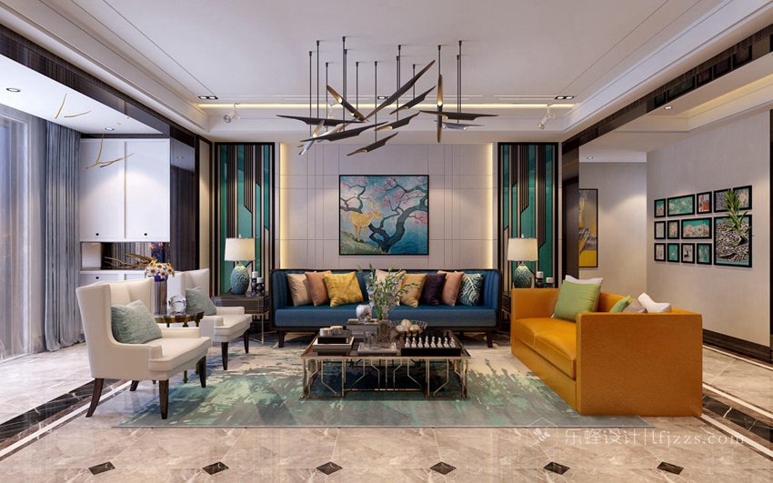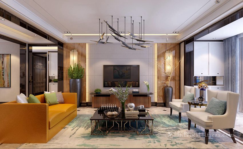 業主把自己對色彩的愛好通過家裝來展現,這也是本案與很多新家不一樣的地方。不同的色彩,有著不同的意象。就像白色,它純潔利落;而主沙發的藍,把持著空間的氣氛走向,展現出它的靜謐端莊和大家氣派;落座一方的橙,明亮活潑,溫暖了整個空間。電視背景墻使用中式風格中常用到的“對稱”,兩側的陶制花瓶卻另辟蹊徑,用一植一枯木的對立造型,打破了對稱的中規中矩,意象的混搭,別有一番韻味。