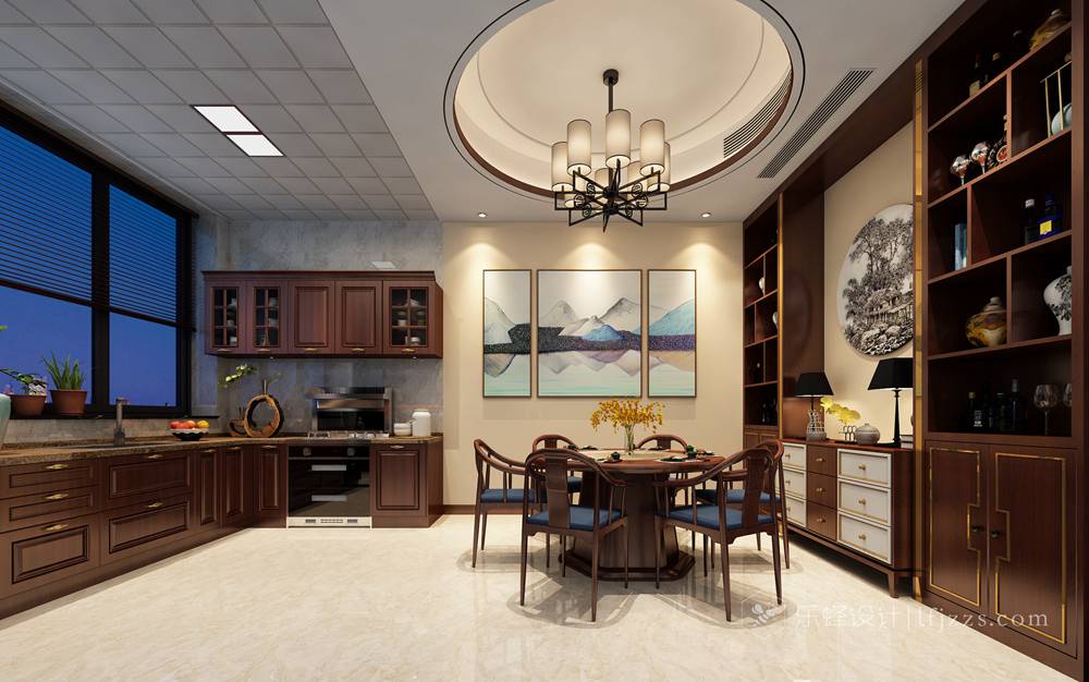 開(kāi)放式餐廚區(qū)設(shè)計(jì),隱藏了兩功能區(qū)的界限,在視覺(jué)上達(dá)到了擴(kuò)大空間的效果。紅木家具是這個(gè)開(kāi)放空間的聯(lián)結(jié)線,它串起了餐廳與廚房的淳樸情感。