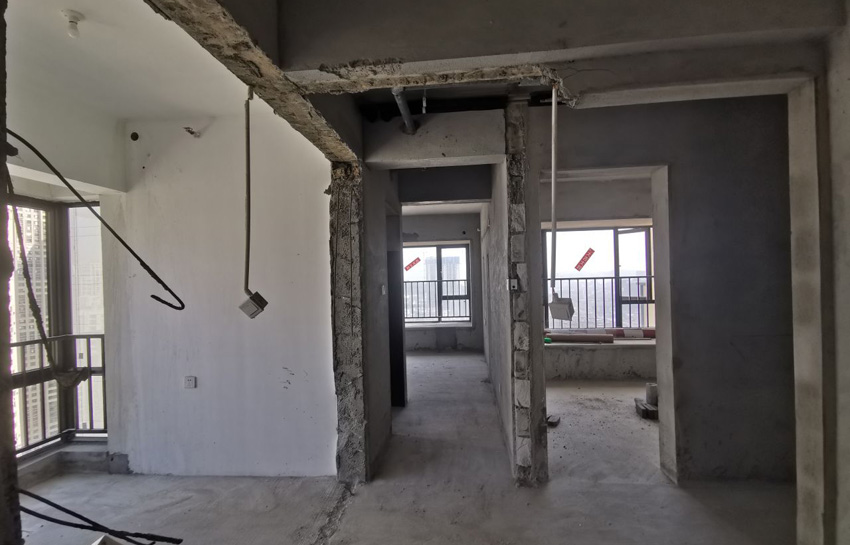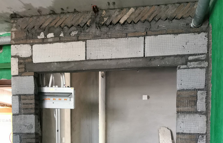 A:墻體拆除已完成 ,等待新建墻體;B:所有新砌墻表面掛鋼網;門頭和窗頭頂過梁用鋼筋混泥土澆制,使均勻受力防止門框下塌開裂;C:新砌墻與頂部天花交接處用10公分小磚斜砌,更好的擠緊與梁、板底的空隙,防止因不均勻沉降以致墻體出現開裂。