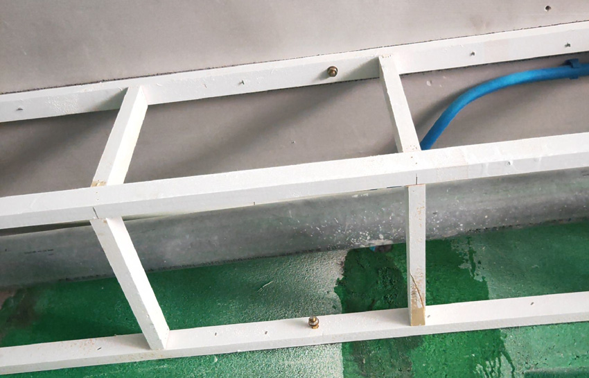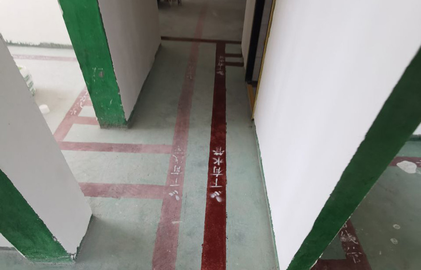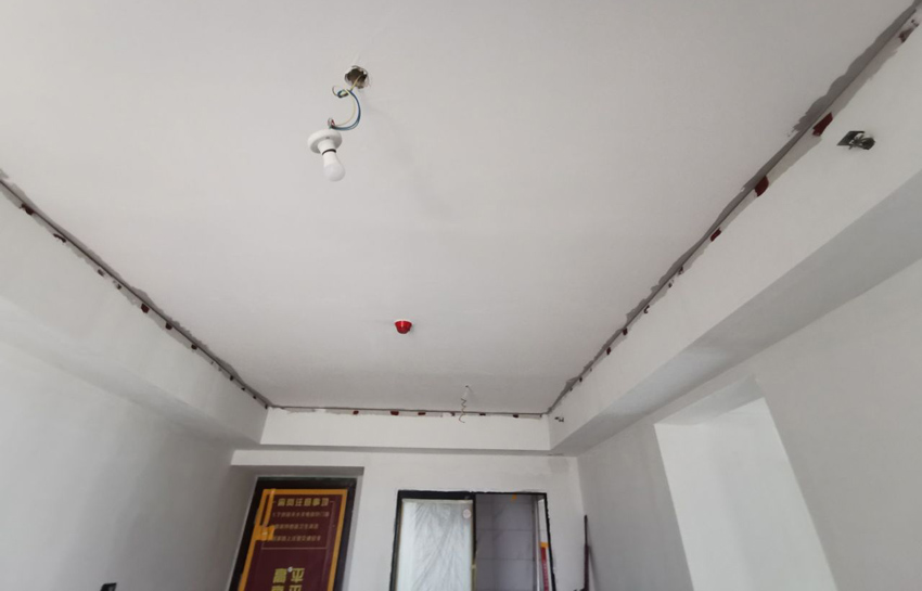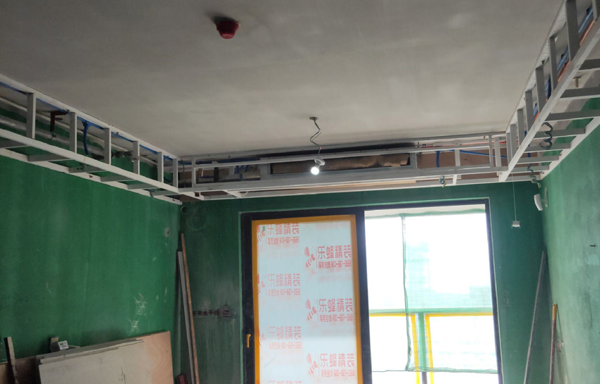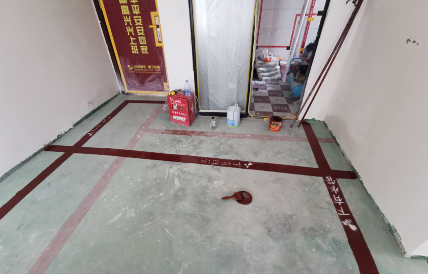 A:天花吊頂龍骨采用防火漆處理拋光木龍骨,每隔60cm用拉爆螺絲與原結構樓板固定;B:水電封槽完畢刷完地寶后,在地面上布有水管線管位置用紅色油漆劃線,標注“下有水管/線管”字樣,方便后期檢修。