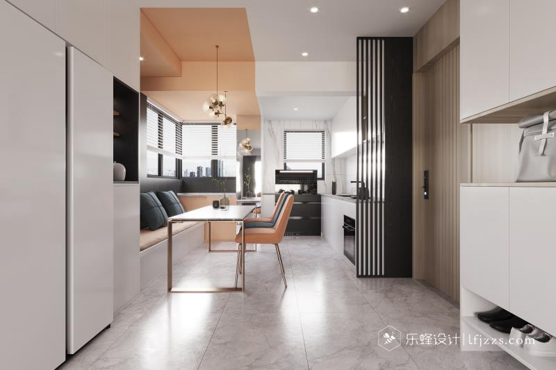 本案色彩簡約,空間以白色為主基調,摒棄傳統的吊燈,使用點光源的筒燈,使燈光更有層次感,整個空間的燈光也更柔和。再搭配墻磚的質感和高純度色彩,來引入一種時尚感。