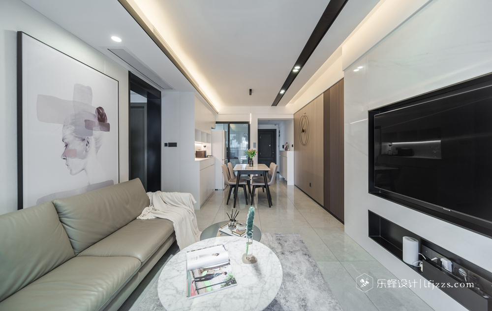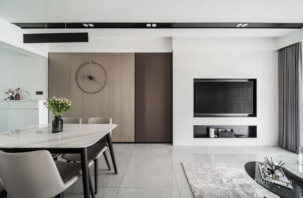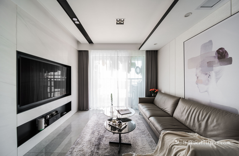 經(jīng)典的黑白灰搭配符合現(xiàn)代人在繽紛多彩的城市追求一份家的寧?kù)o,簡(jiǎn)潔且舒適。沙發(fā)的皮質(zhì)柔軟跟電視背景墻的硬朗質(zhì)感對(duì)比鮮明,小對(duì)比映襯出大道理。
