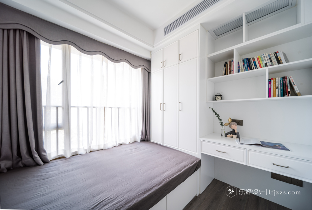 空間看似簡(jiǎn)單,卻巧妙地運(yùn)用了色彩去營(yíng)造舒適的視覺效果。采用榻榻米的形式連接著一個(gè)頂天立地的櫥柜,巧妙的搭配上一個(gè)小桌子,即滿足了收納空間也看起來更違和,大氣。