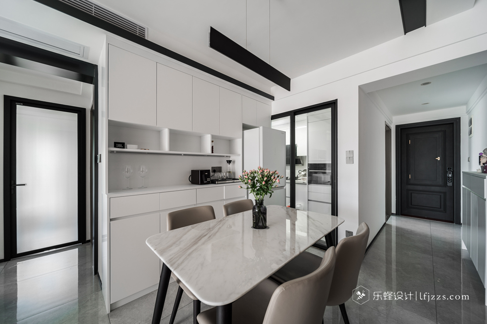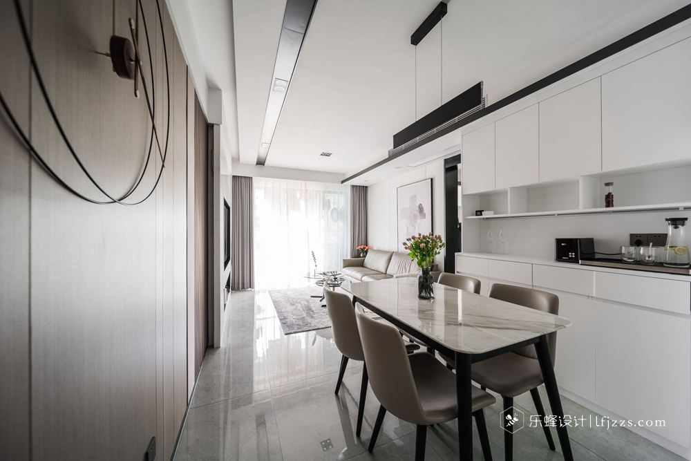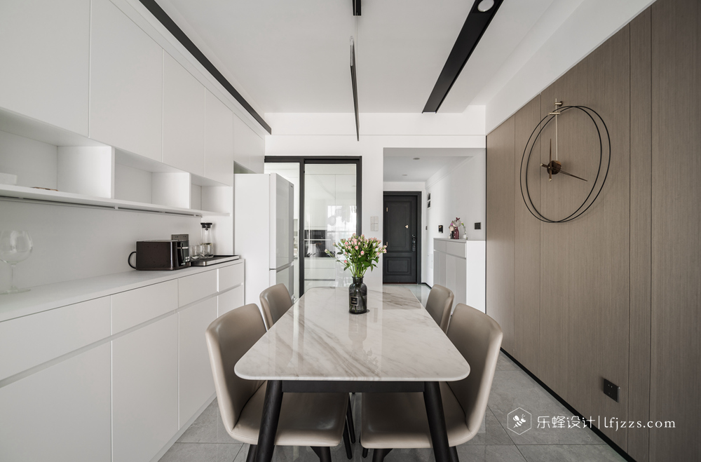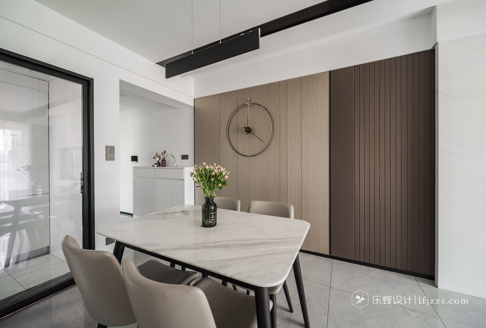 餐廳在和客廳統(tǒng)一格調(diào)的情況下兼顧區(qū)域特色,采用花紋大理石與原木色的碰撞,色澤統(tǒng)一風(fēng)格,木紋的質(zhì)感仿佛在拉進(jìn)畫面視覺的柔軟,餐桌采用白色大理石帶一絲絲灰色,與整個(gè)空間遙相呼應(yīng)。