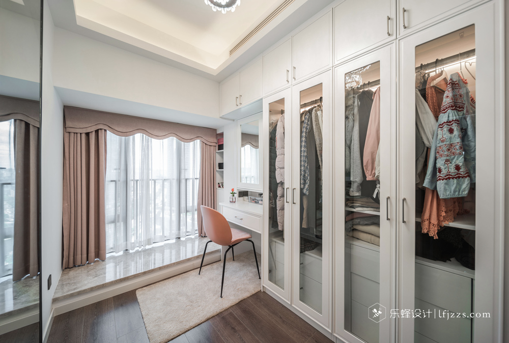 衣帽間延續(xù)整個(gè)空間的風(fēng)格,做成拉手式的把手,透明玻璃的搭配,使得更容易的找到想要的東西,梳妝臺(tái)以白色與粉色凳子的搭配,使得空間更加的俏皮。