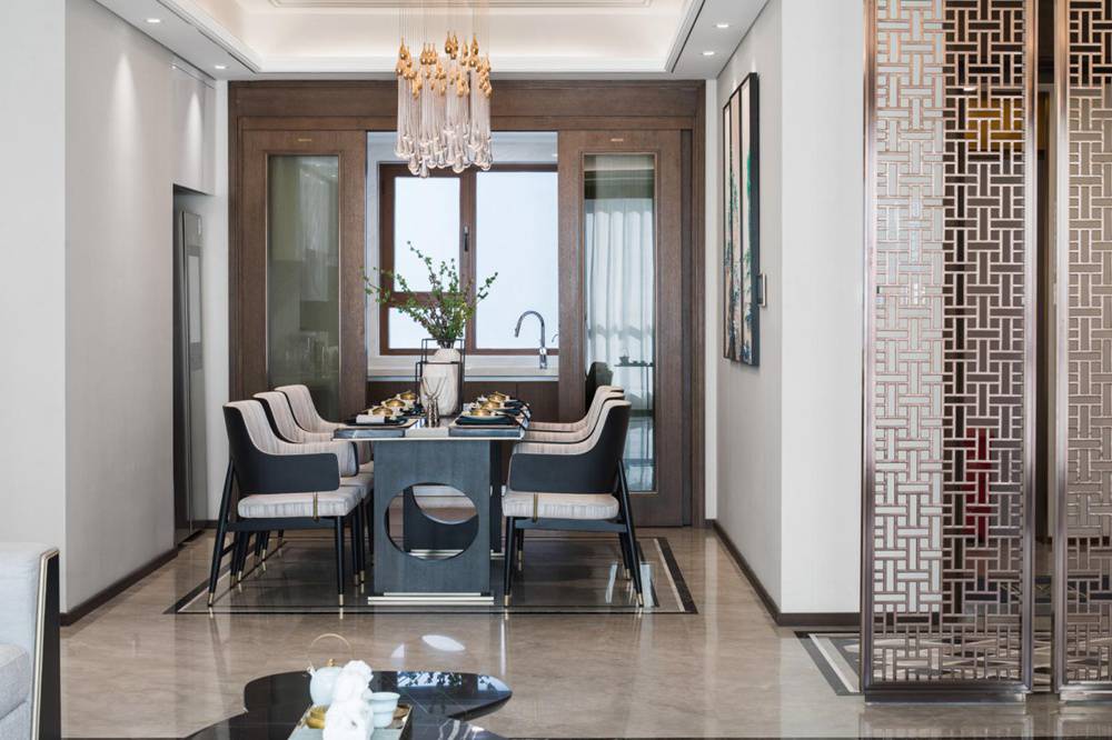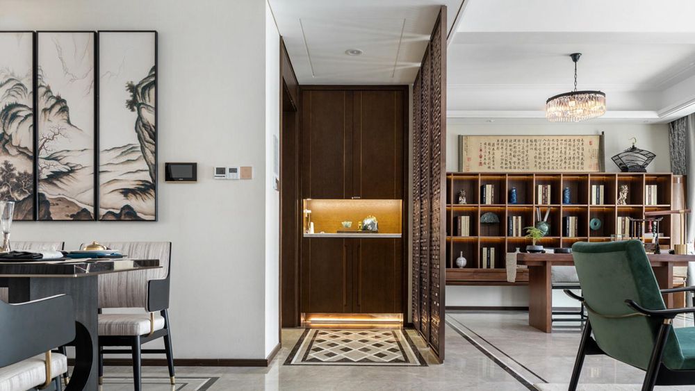 餐廳與客廳,兩廳遙相對稱,延續客廳的設計基調。書畫墨香,背景墻的山水畫,盆景的清雅,給餐廳更添一分人情味道。