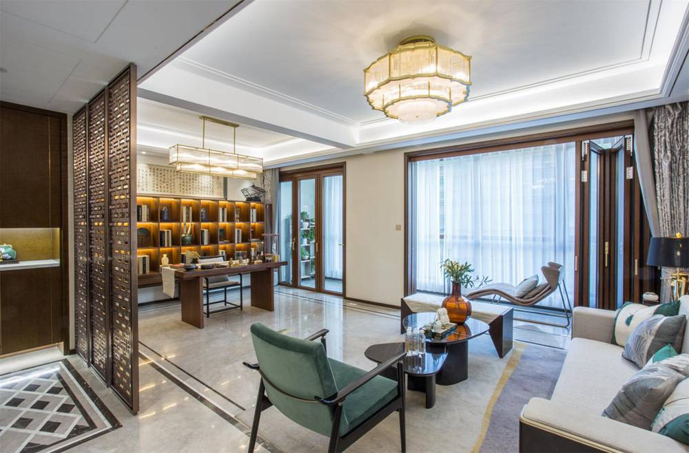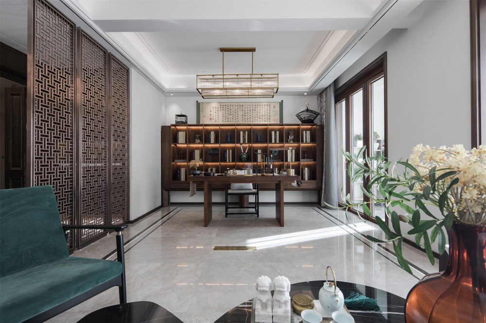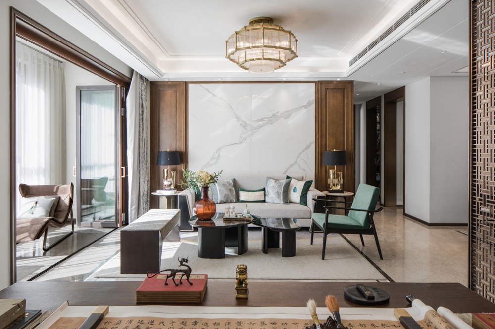 打通了客廳的空間,旁邊中式的推拉門跟陽臺相呼應,后面做了一個中式的書架,一些書籍和書寫的東西放在上面,更方便拿起給空間涂寫上意境