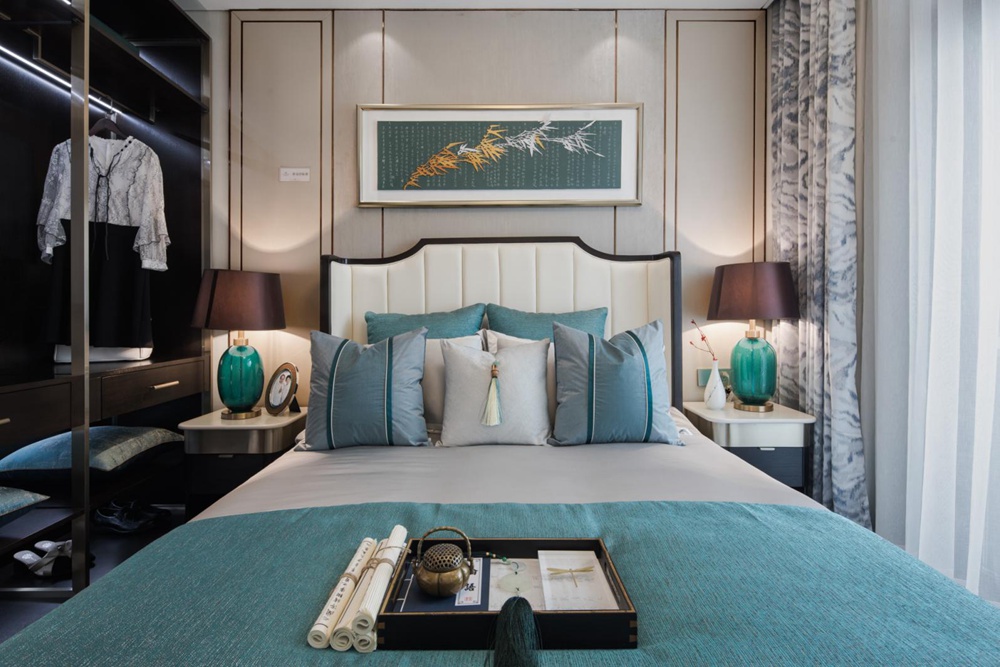臥室也用山水畫的床頭背景墻來營造平衡、優雅的中式美感