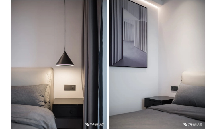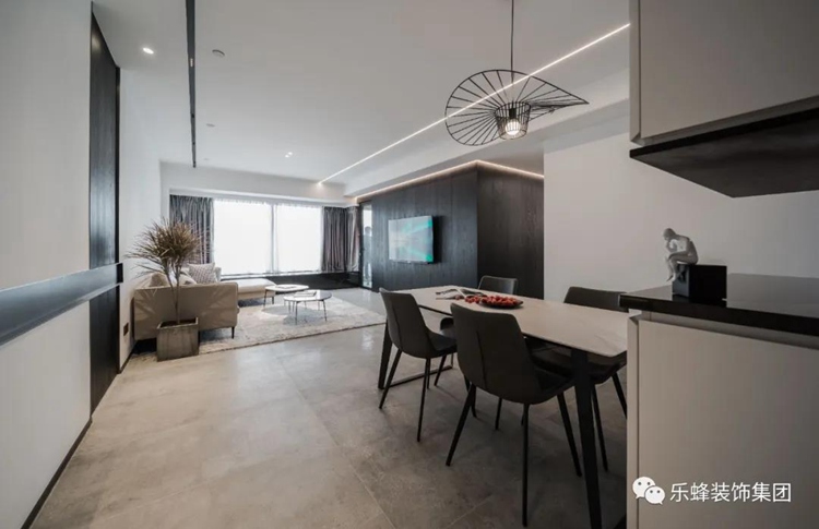 黑色單面背景墻的設計格調,搭配可溫度感應的藝術吊燈,簡約功能性完善,很符合屋主的調性。
