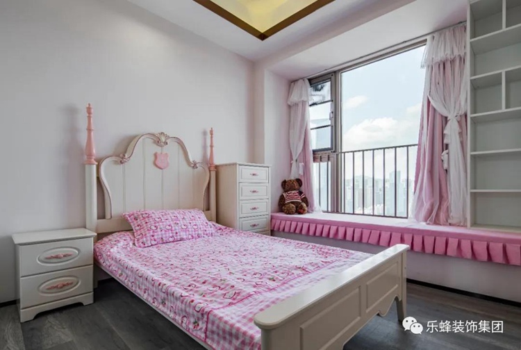 睡眠區暖色系的硬裝+深色軟裝,提升整體色彩飽和度和層次感。由于屋主小女兒喜歡粉色,我們把粉色與白色融合進去,裝扮一個公主少女粉的甜蜜空間。