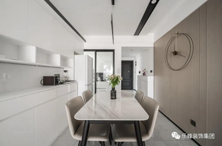 西廚墻面部分采用淺色大理石,增加視覺觀感;西廚櫥柜采用上下分色設計,空間層次感提升。地磚材質及尺寸的運用上,設計師用長條形大磚,加大客餐廳的進深。不銹鋼線條+簡約硬包背景+大面積無主燈設計平頂,空間看起來更大氣。