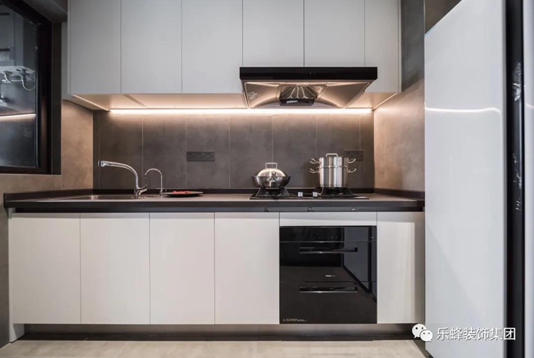 廚房內的免漆板櫥柜不僅觸感光滑舒適,也好打理;在燈光聚焦下,散發的煙火氣也高級特別了些。