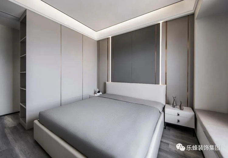 主臥以白色為基礎色調,木色、灰色、粉色加以輔助修飾,溫婉格調,頗具優雅。