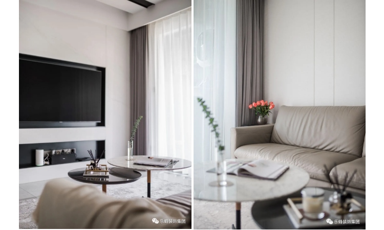 客廳與餐廳開放式布局,讓家的動線更靈活,落地窗滿足了對通風與采光的需求。嵌入式電視柜設計精致美觀,C位出道;黑白圓形輕奢茶幾提升家的氣質,電視墻做了壁龕設計,平日里可做簡單的收納空間。