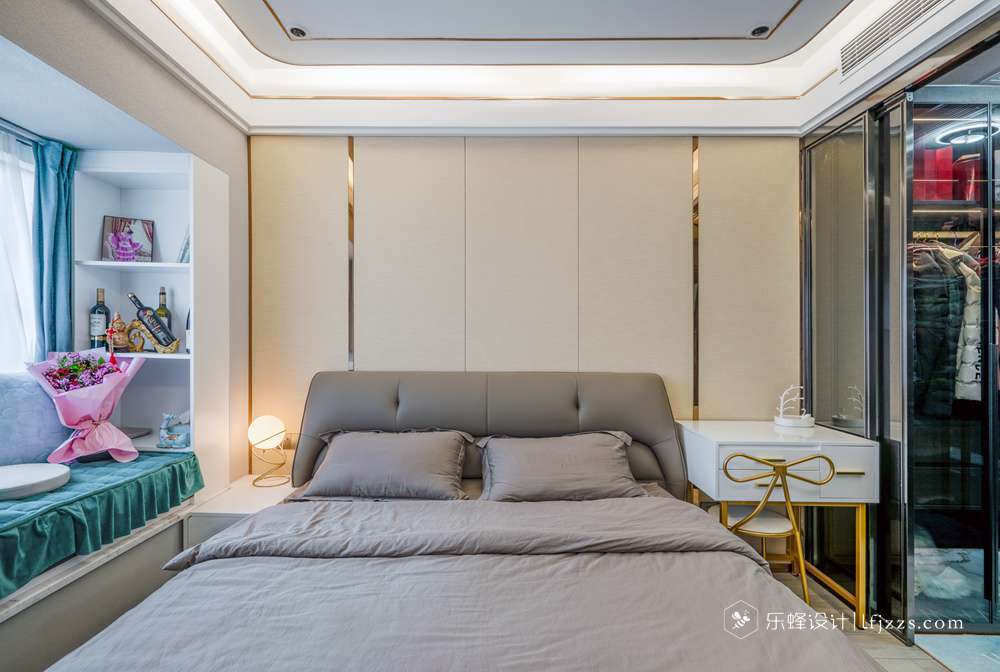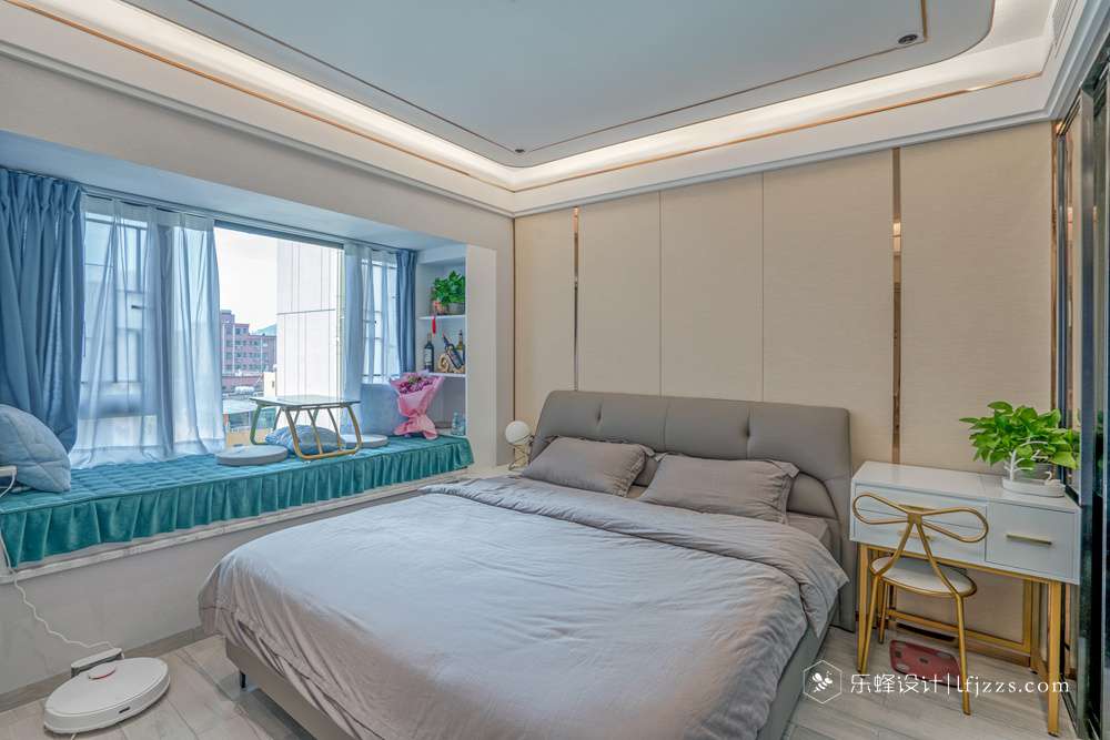 灰藍色的碰撞,背景線條采用金屬邊與隱藏式燈帶相呼應,顯得整個空間更加的奢華,整塊飄窗做成一個休息的地方,顯得空間更加的溫馨。