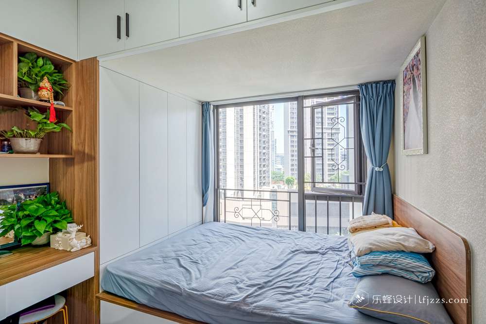 床做成榻榻米的樣式,旁邊和上面做了超級多的柜子,這樣不失美觀又不浪費空間,利用原木與純白的搭配,旁邊做了一個柜子,平時可以在上面看看書辦辦公,用綠植把整個空間襯托的更加有生機。