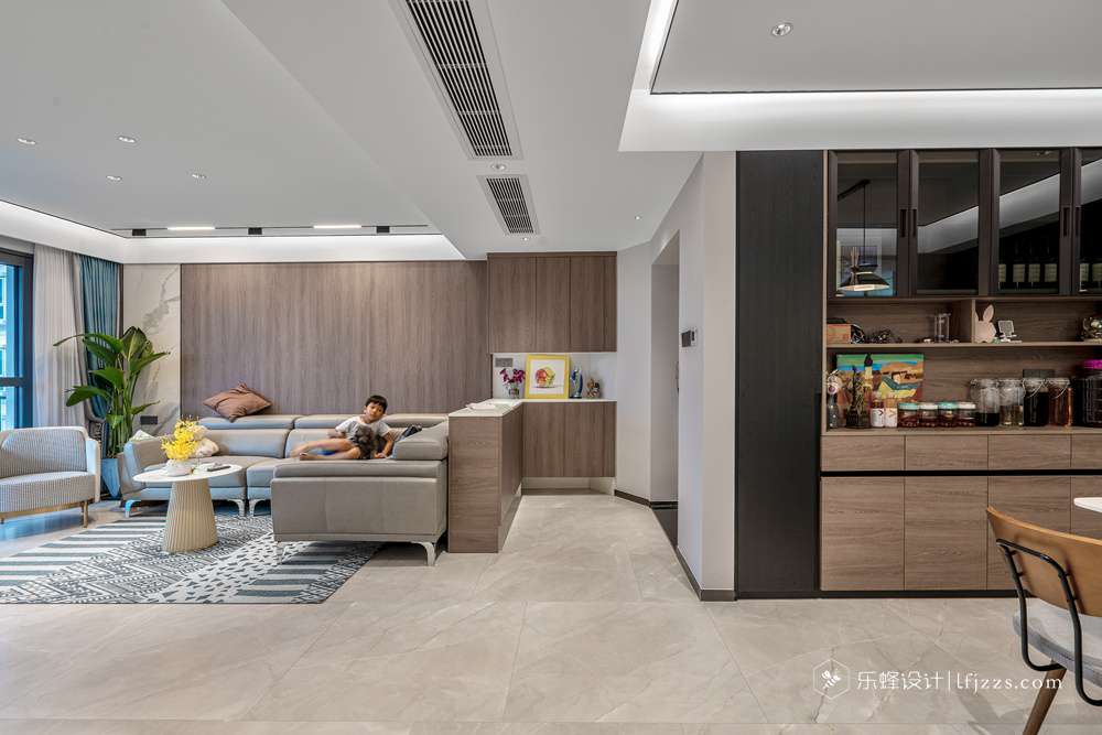 餐廳延續了客廳的立面材質,是開放格與西廚的連體設計,西廚區嵌入酒柜,各類珍藏好酒都能冷藏,取酒時也一目了然。
