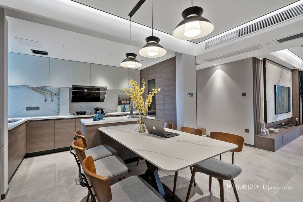 餐廳與廚房是開放式的,廚房考慮到油煙問題,所以在天花處留了一條槽位,就是我們推拉門的軌道位置,假如油煙問題確實造成困擾,后期做一個推拉門把廚房作為封閉式。