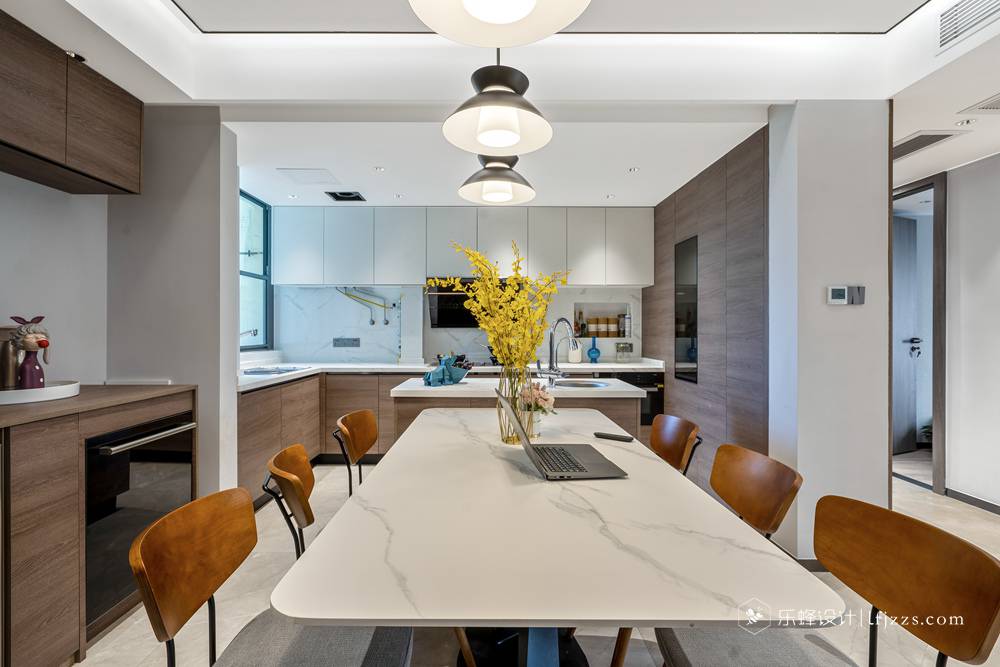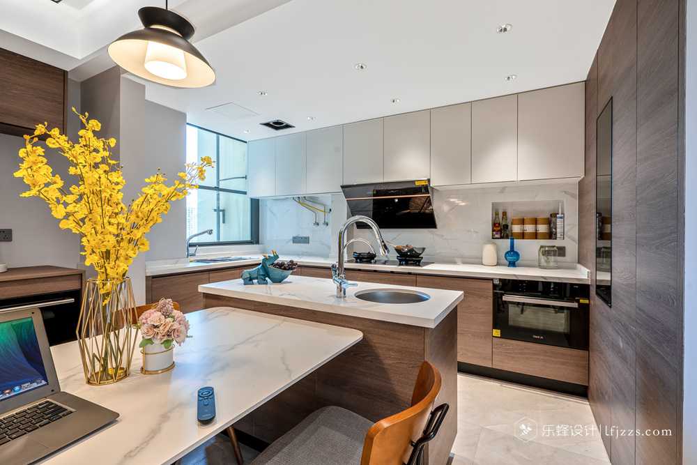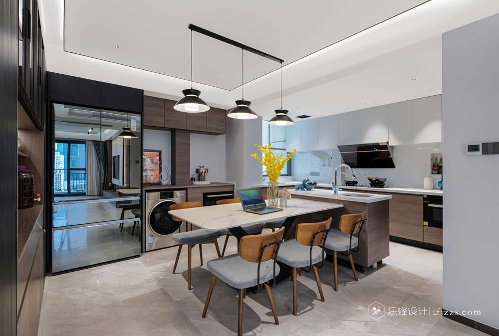 考慮到太太用廚房時的一個操作形式,所以臺面做的比較多,然后做一個小島臺與餐桌連為一體,平時操作時,家里人可以一同互動,和諧親密,做菜也不會過于單調。