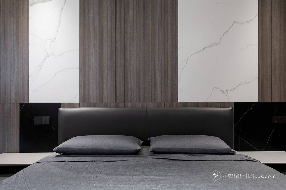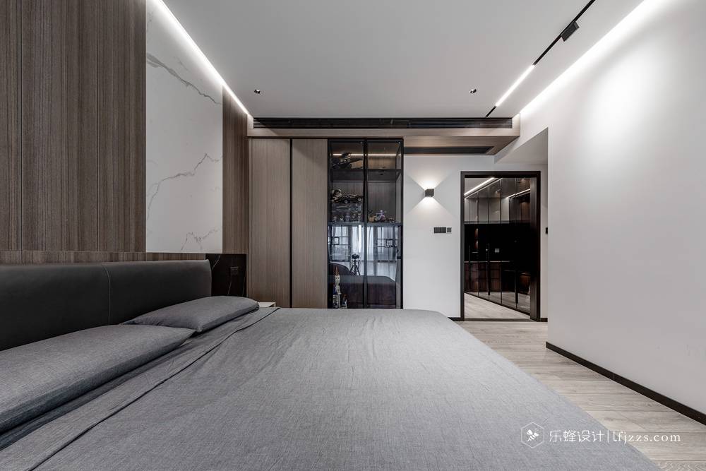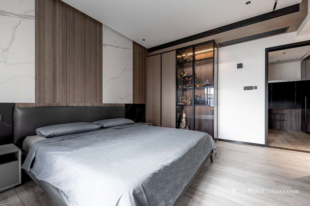 臥室采用木地板加上黑色的門檻,背景墻采用大理石和原木的碰撞,使得整個背景墻看起來更加的大氣,在轉角進來的地方做了一個頂天立地的柜子,用上透明的玻璃,因為屋里主人平時會有一些小的收藏品,這樣既有地方存放又可以更直觀的看到心愛的東西。