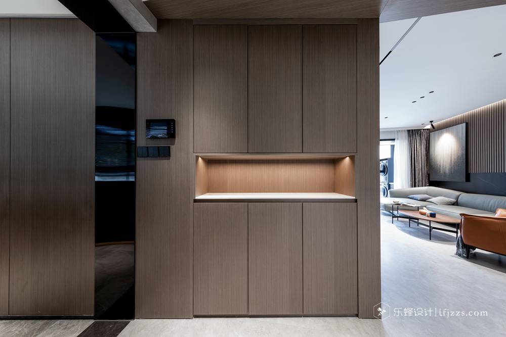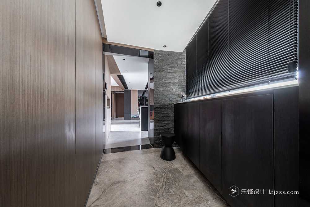 玄關入戶門地面采用的是灰色大理石,右邊運用黑色做了一排矮柜,搭配上百葉窗,左邊引用咖色把整個柜子做到了頂部,運用兩種不同的顏色給整個空間形成一種撞色。