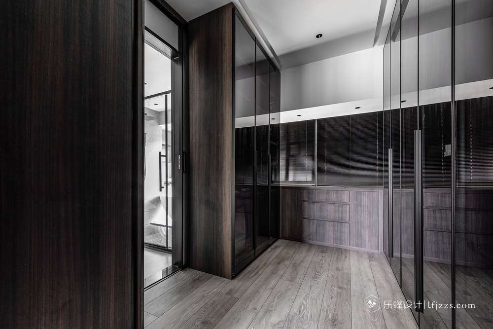 女主人用超多的衣物,為她留出來了一個空間作為衣帽間。衣帽間由實木層板與深色玻璃相結合。柜體材質是木飾面,玻璃門與黑色金屬拉手,給人很強的高級感,工藝細膩彰顯簡約品質。